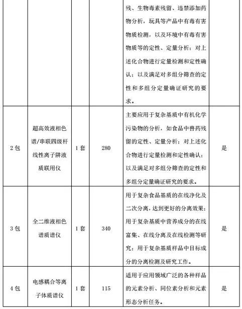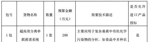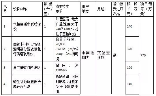 近日,為提升院所檢驗(yàn)檢疫水平,完善儀器設(shè)備配置,中國(guó)檢科院就2018年儀器設(shè)備采購(gòu)項(xiàng)目進(jìn)行公開(kāi)招標(biāo)公告。共發(fā)出5則招標(biāo)公告,包括中國(guó)檢科院2018年實(shí)驗(yàn)室儀器設(shè)備采購(gòu)項(xiàng)目編號(hào):GXTC-18500030、項(xiàng)目編號(hào):0706-17410004N022/1、2、3、4包、項(xiàng)目編號(hào):0773-1841GNOBHWGK0437、項(xiàng)目編號(hào):17CNIC01-2108、項(xiàng)目編號(hào):18CNIC01-2005。預(yù)算總金額為4713萬(wàn)元。根據(jù)招標(biāo)內(nèi)容,本次采購(gòu)的儀器涉及高分辨液相色譜四級(jí)桿飛行時(shí)間串聯(lián)質(zhì)譜系統(tǒng)、氣相色譜串聯(lián)質(zhì)譜儀、全二維液相色譜儀、離子色譜儀、四級(jí)桿-靜電場(chǎng)軌道阱高分辨液相色譜質(zhì)譜聯(lián)用儀、質(zhì)譜顯微鏡、三合一高分辨液質(zhì)等儀器設(shè)備,具體采購(gòu)情況如下:中國(guó)檢科院2018年實(shí)驗(yàn)室儀器設(shè)備采購(gòu)項(xiàng)目編號(hào):GXTC-18500030預(yù)算金額:1028.0 萬(wàn)元(人民幣)投標(biāo)截止及開(kāi)標(biāo)時(shí)間:2018年04月12日 09:30